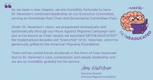 Amy Wickstrom, Executive Director, shared her enthusiasm for Dr. Newman’s leadership “As we open a new chapter in building the legacy of the American Migraine Foundation, we are fortunate to have Dr. Newman’s continued leadership on our Executive Committee serving as Immediate Past Chair and Chair of the Governance Committee. Under Dr. Newman’s vision, we have progressed strategically and systematically through our Move Against Migraine Campaign–and, as his tenure as Chair closed, we launched GETHEADUCATED™, an enduring education campaign to activate the migraine community. Thank you to Dr. Newman for gifting this trademarked “brainchild” to the American Migraine Foundation.” – Amy Wickstrom