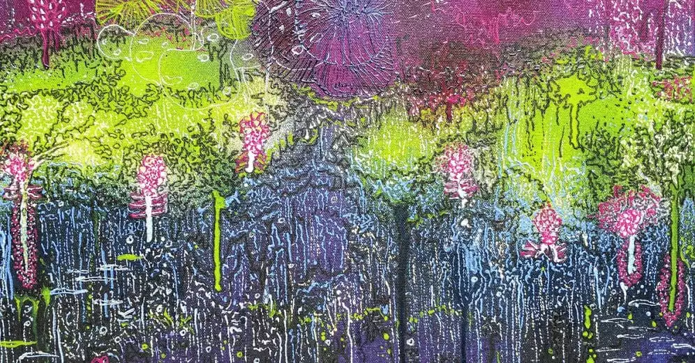 I “see” things during a migraine attack, and the older I get, the more colorful and detailed these images become. When I’m bedridden, the images are dazzling! Painting these images was an epiphany—I paint anyway, so why not paint the migraine imagery? This would be my story, something that would be unique to me. And, the more I painted, the more the images grew. I have invited “them” in—I have given permission.